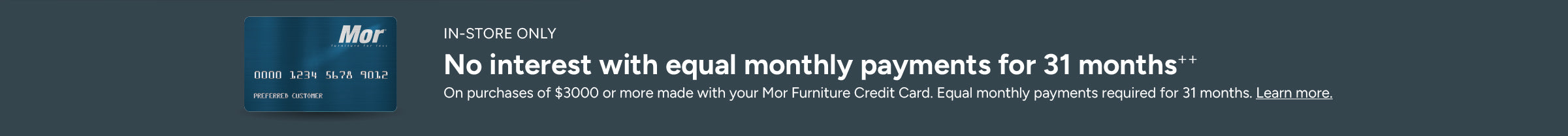 We find that many casual shoppers become Mor Furniture for Less customers for life after purchasing home furniture from our friendly design associates. That's because here at Mor, we present several undeniable offers. Not only do we offer traditional price matching to ensure that if the sum of your total purchase is offered for less during the 30 days after receiving your merchandise, we will issue you an in-store credit for the difference, but we also feature a Double-the-Difference Guarantee. This guarantee states that should you find an identical piece of home furniture at a local competitor for less within 30 days after receiving your merchandise, we will give you back the difference as a store credit times two. Not many furniture stores can say that.