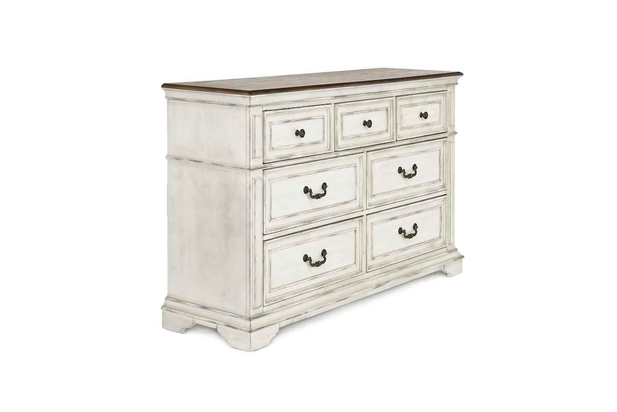 If you're looking for a piece with some color contrast, check out the Joanna Dresser in White! The light and dark shades of white and brown enhance this dresser's simple design. This dresser for women contains seven drawers with side-mounted ball bearings and molded panel fronts. A brown slab top and bronze-shaded metal pull handles on each drawer contrast nicely with the dresser's white finish.