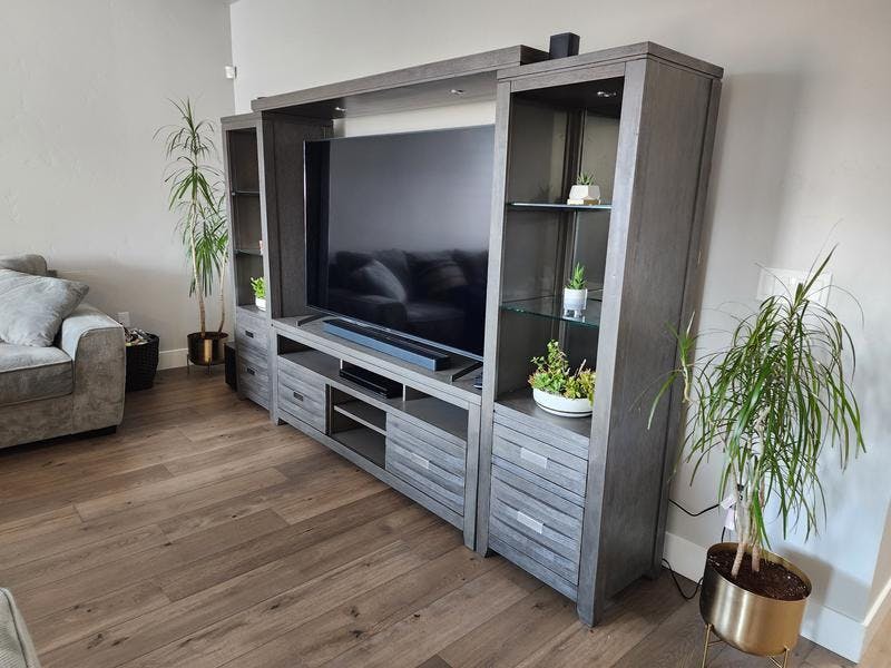The Altamonte Media Piers in Black is great for media storage, as a bookcase, or displaying your favorite home décor pieces. With their sleek, contemporary design and black wire-brush finish, you’ll find many useful ways to integrate these great pieces into your home, either as stand-alone items or as part of your entertainment system. Each pier offers two drawers, three fixed glass shelves, and an overhead light giving you maximum storage and display options.