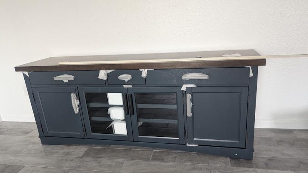 We recently purchased this console and had it delivered. It arrived perfect condition. It is beautiful and a solid piece of furniture. Then the top is dark as pictured. However the light bluish gray color depicted in the photo is not what we received. It is more of a greenish teal. Much darker was then shown in the picture. It is beautiful however the photo is not true to color