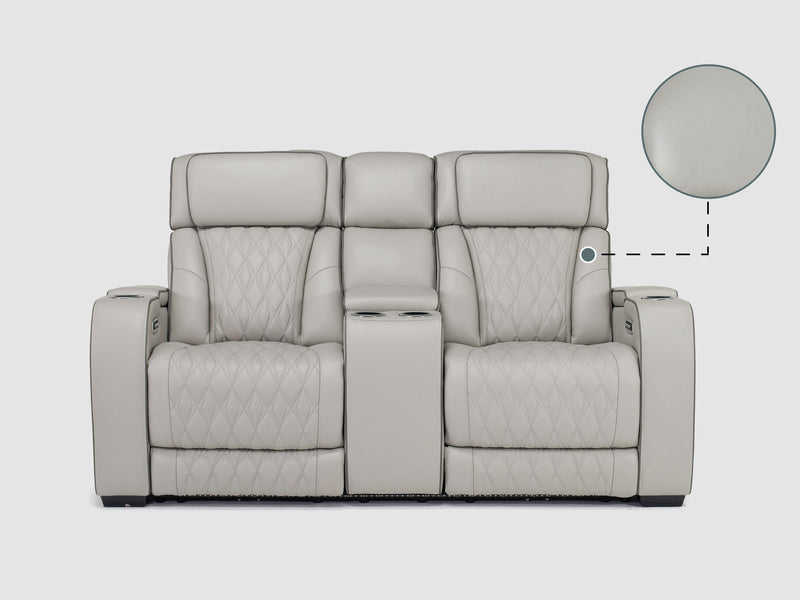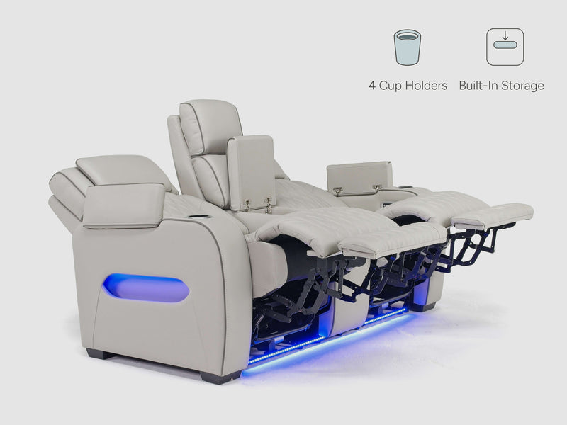 Transform your home theater experience with dual power reclining that allows independent adjustment of both seats. The integrated console provides convenient storage and cup holders, while the striking blue LED base lighting creates an immersive cinema atmosphere and adds a modern touch to your entertainment space.