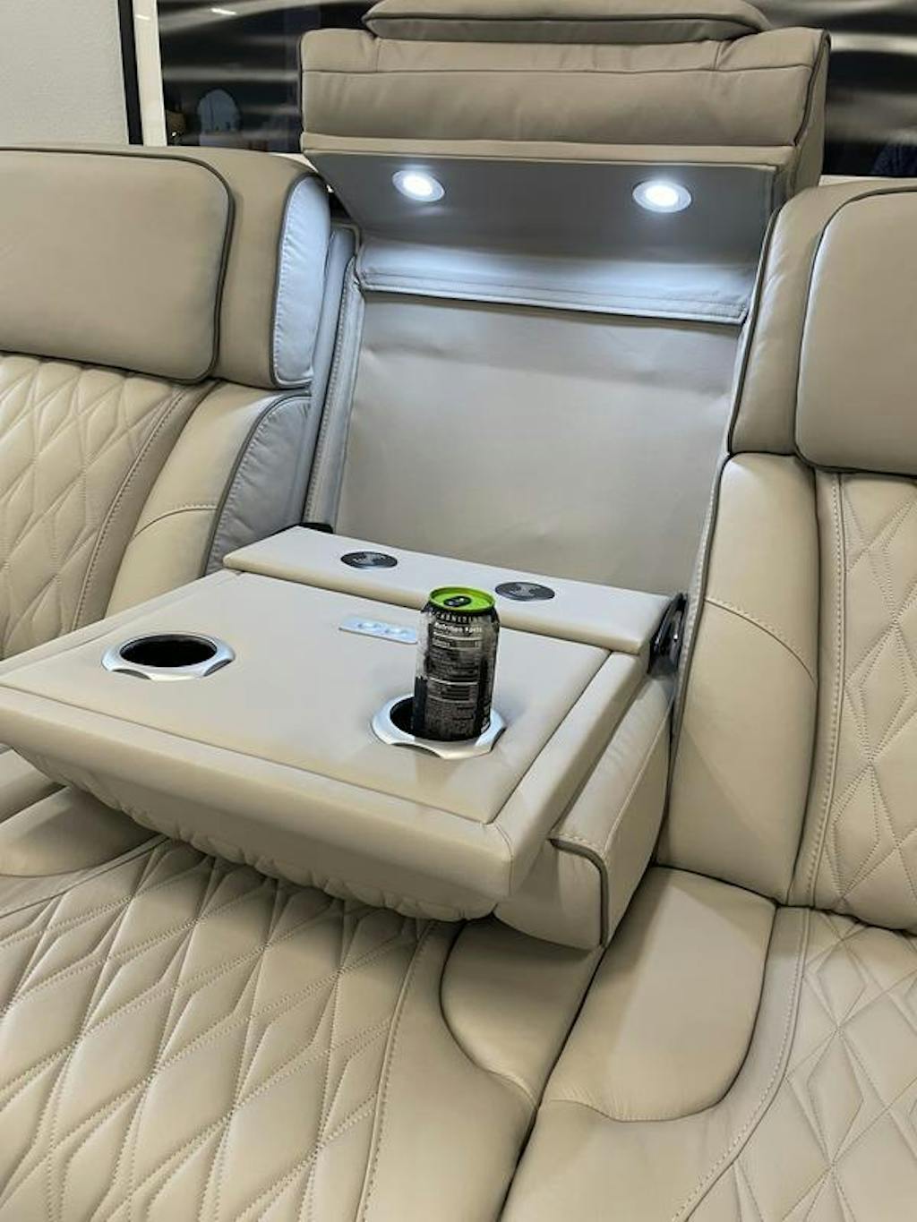 - Armrests with flip-top storage and cup holder