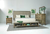 Upholstered bed with storage footboard, dresser, mirror, and nightstand in matching vintage gray finish for cohesive rustic bedroom.