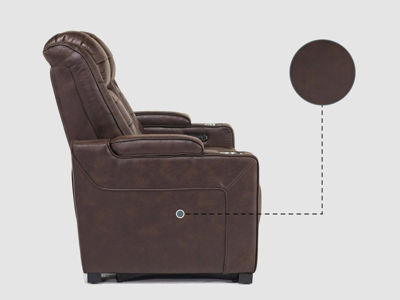 Enjoy convenient amenities with the built-in center console featuring dual stainless steel cup holders and hidden storage compartment. Perfect for keeping beverages secure and storing remotes, magazines, or personal items within easy reach during movie nights.