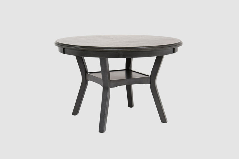 47″ round dining table fits small dining areas or multipurpose rooms, with an under-table shelf for easy storage of dishes or game-night essentials.