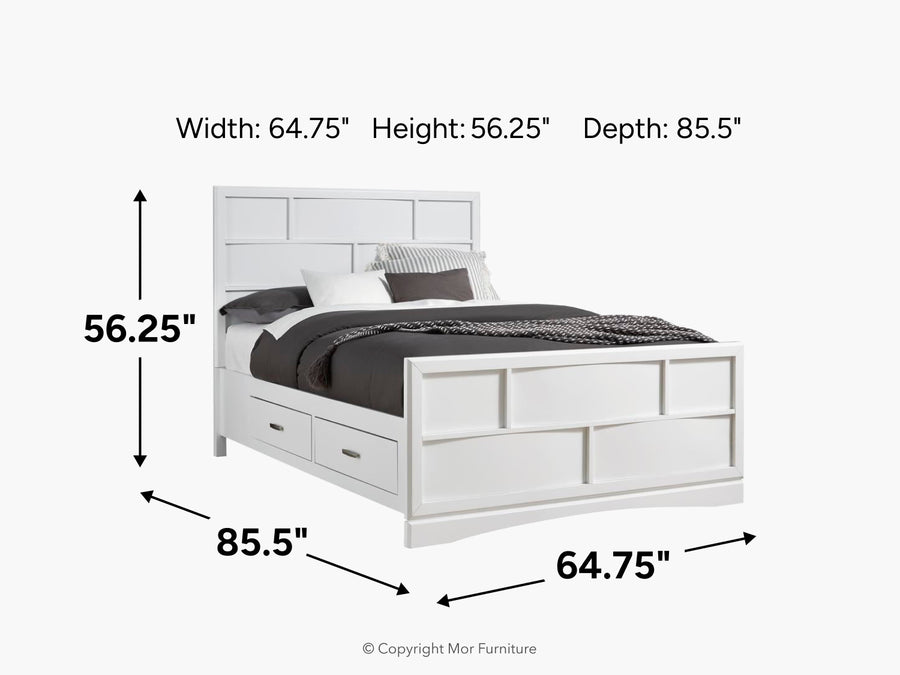 Your beautiful, restful bedroom oasis awaits. This Ontario Panel Bed w/ Storage in White, Eastern King offers comfort, convenience, style, and lasting quality. It’s perfect for contemporary and transitional spaces, and the storage drawers underneath are ideal for your extra blankets, pillows, sheets, winter clothing, and more.Product Details:• Clean lines and light color blend beautifully with your decor style• Pair with other pieces from the lovely Ontario bedroom collection, including dressers and a nightstand, for a complete set• Crafted from solid hardwoods for lasting quality; mattress and bedding not included• Weight limit 800 lbs• Convenient lower drawers for needed extra storage spaceDimensions:• 82”W x 85”D x 60”H