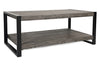 The Pinnacle Coffee Table in Gray pairs a sculptural steel frame with distressed wood in a cool, platinum finish for a modern industrial look. A lower shelf offers space for storage and display.