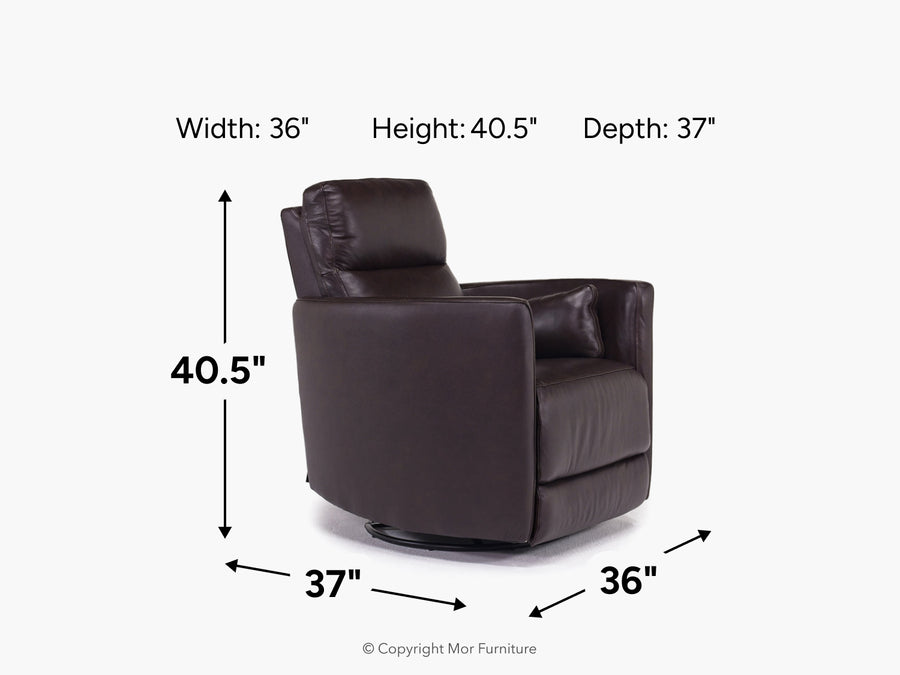 Upgrade your living room with the Retreat Swivel Gliding Recliner in Brown. Its stylish design, comfortable features, and practical functionality make it a worthy addition to any home. The swivel function allows you to easily turn in any direction for added convenience. Its black metal legs provide excellent stability, while the rail design adds a touch of class. This recliner also includes two inside bolster pillows for extra support.Product Details: • The seat back is designed to be tight, providing excellent lumbar support • The black finish gives it a timeless appeal • The seat is made of high-quality leather, ensuring durability and comfort