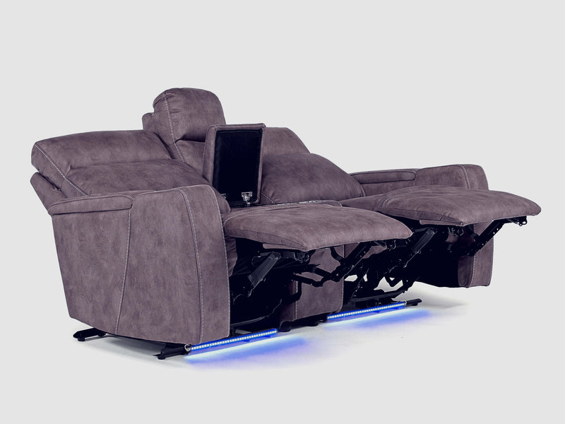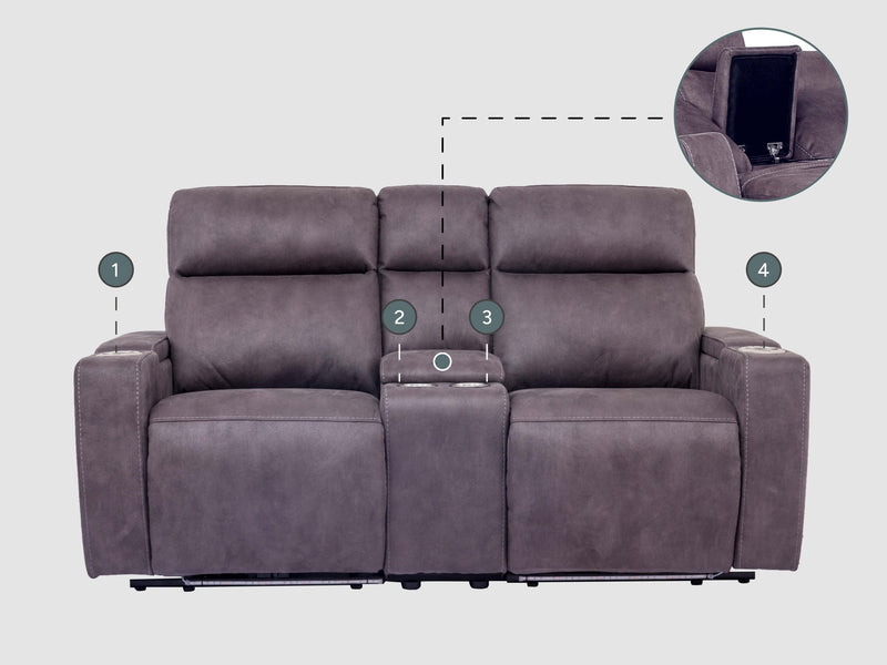 Built-in console between seats provides convenient storage for remotes, drinks, and personal items. Flip-up design keeps essentials organized and within easy reach during relaxation time.