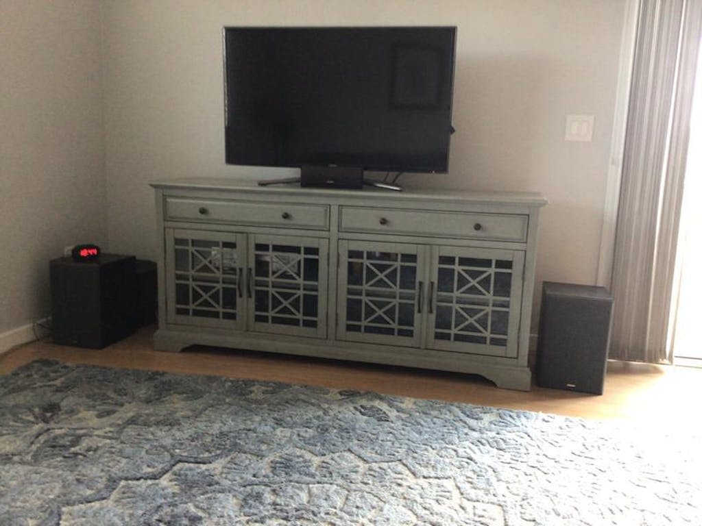 This is a great tv console. It's a different gray tone than your regular gray but it looks perfect against my dark charcoal gray back wall. It really pops out against the contrast. It's the perfect compliment to a large screen tv with lots of storage spaces.